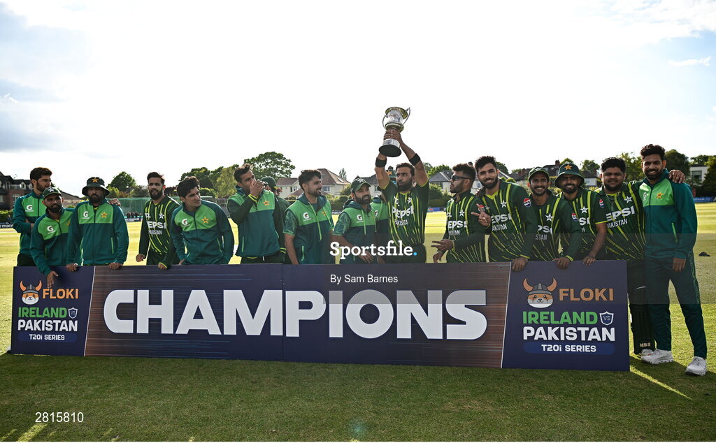 14 May 2024; Pakistan players celebrate with the trophy after winning match three and the Floki Men's T20 International Series between Ireland and Pakistan at Castle Avenue Cricket Ground in Dublin. Photo by Sam Barnes/Sportsfile