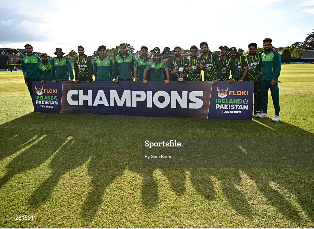 14 May 2024; Pakistan players celebrate with the trophy after winning match three and the Floki Men's T20 International Series between Ireland and Pakistan at Castle Avenue Cricket Ground in Dublin. Photo by Sam Barnes/Sportsfile