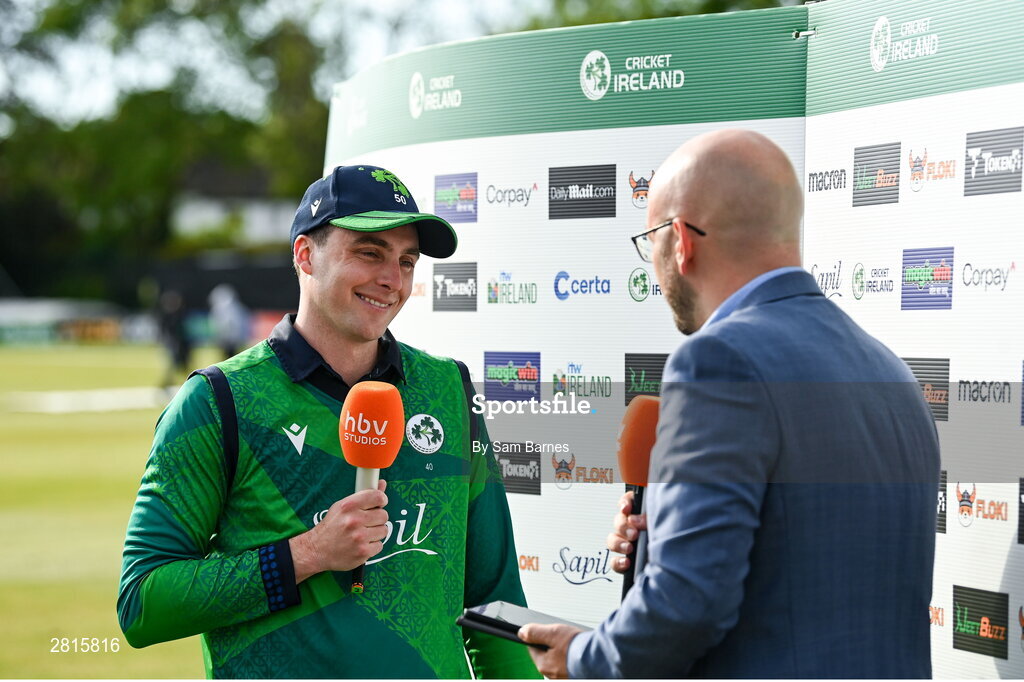 14 May 2024; Ireland captain Lorcan Tucker is interviewed by HBV Studios presenter Andrew Leonard after his side's defeat match three of the Floki Men's T20 International Series between Ireland and Pakistan at Castle Avenue Cricket Ground in Dublin. Photo by Sam Barnes/Sportsfile