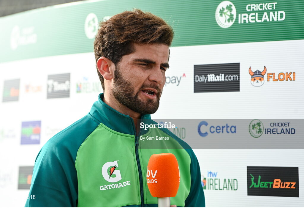14 May 2024; Player of the match Shaheen Shah Afridi is interviewed after his side's victory in match three of the Floki Men's T20 International Series between Ireland and Pakistan at Castle Avenue Cricket Ground in Dublin. Photo by Sam Barnes/Sportsfile