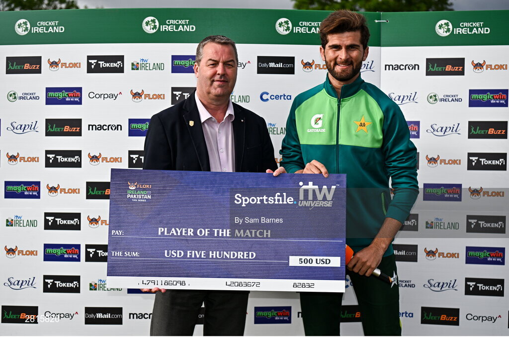 14 May 2024; Shaheen Shah Afridi of Pakistan is presented with the player of the match award by Cricket Ireland Chairperson Brian McNeice during match three of the Floki Men's T20 International Series between Ireland and Pakistan at Castle Avenue Cricket Ground in Dublin. Photo by Sam Barnes/Sportsfile