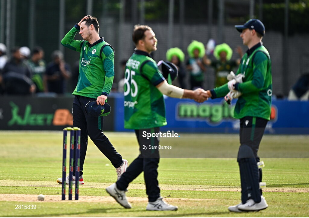 14 May 2024; George Dockrell of Ireland, left, reacts after his side's defeat in match three of the Floki Men's T20 International Series between Ireland and Pakistan at Castle Avenue Cricket Ground in Dublin. Photo by Sam Barnes/Sportsfile