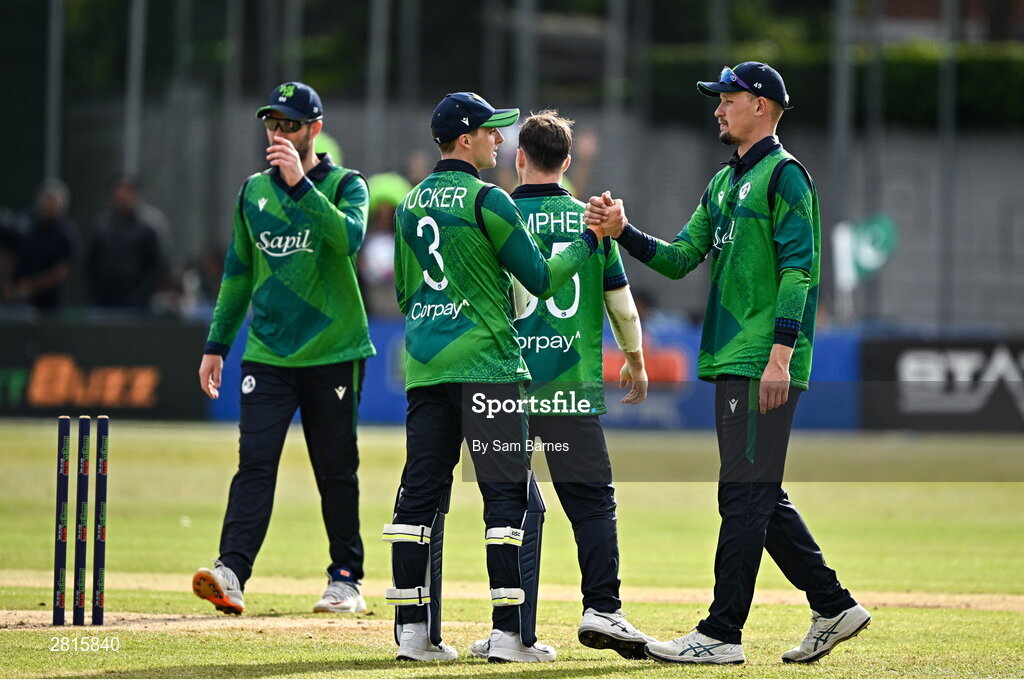 14 May 2024; Ireland players including Lorcan Tucker, 3, and Ben White, right, shake hands after their side's defeat in match three of the Floki Men's T20 International Series between Ireland and Pakistan at Castle Avenue Cricket Ground in Dublin. Photo by Sam Barnes/Sportsfile