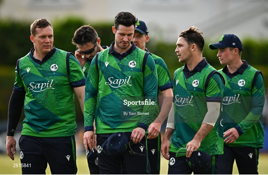14 May 2024; Ireland players leave the field dejected after their side's defeat in match three of the Floki Men's T20 International Series between Ireland and Pakistan at Castle Avenue Cricket Ground in Dublin. Photo by Sam Barnes/Sportsfile