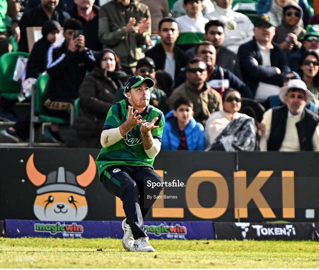 14 May 2024; Curtis Campher of Ireland catches out Babar Azam of Pakistan during match three of the Floki Men's T20 International Series between Ireland and Pakistan at Castle Avenue Cricket Ground in Dublin. Photo by Sam Barnes/Sportsfile