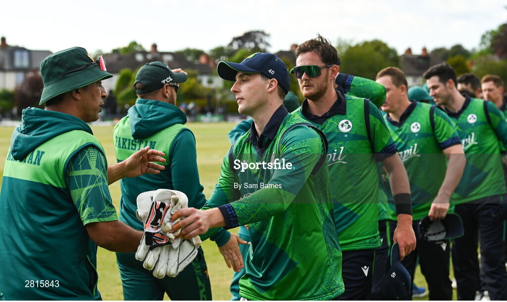 14 May 2024; Ireland captain Lorcan Tucker shakes hands with members of the Pakistan backroom team after his side's defeat in match three of the Floki Men's T20 International Series between Ireland and Pakistan at Castle Avenue Cricket Ground in Dublin. Photo by Sam Barnes/Sportsfile