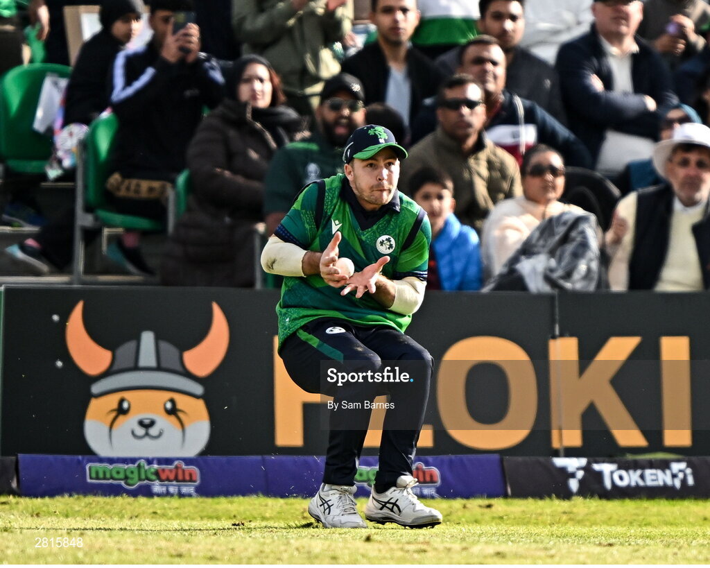 14 May 2024; Curtis Campher of Ireland catches out Babar Azam of Pakistan during match three of the Floki Men's T20 International Series between Ireland and Pakistan at Castle Avenue Cricket Ground in Dublin. Photo by Sam Barnes/Sportsfile