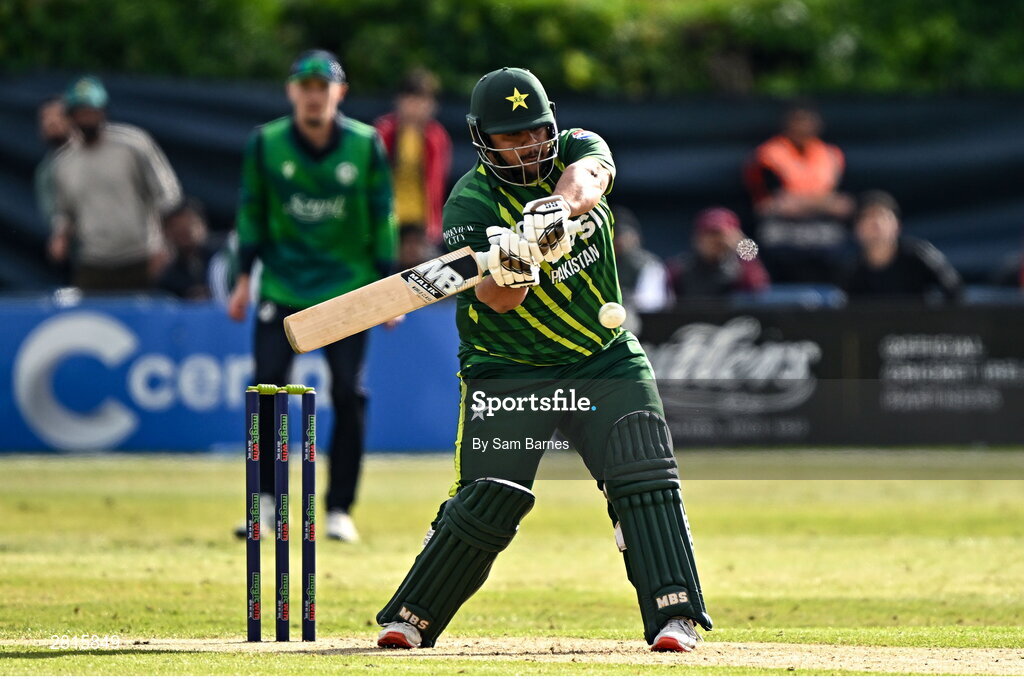 14 May 2024; Azam Khan of Pakistan bats during match three of the Floki Men's T20 International Series between Ireland and Pakistan at Castle Avenue Cricket Ground in Dublin. Photo by Sam Barnes/Sportsfile