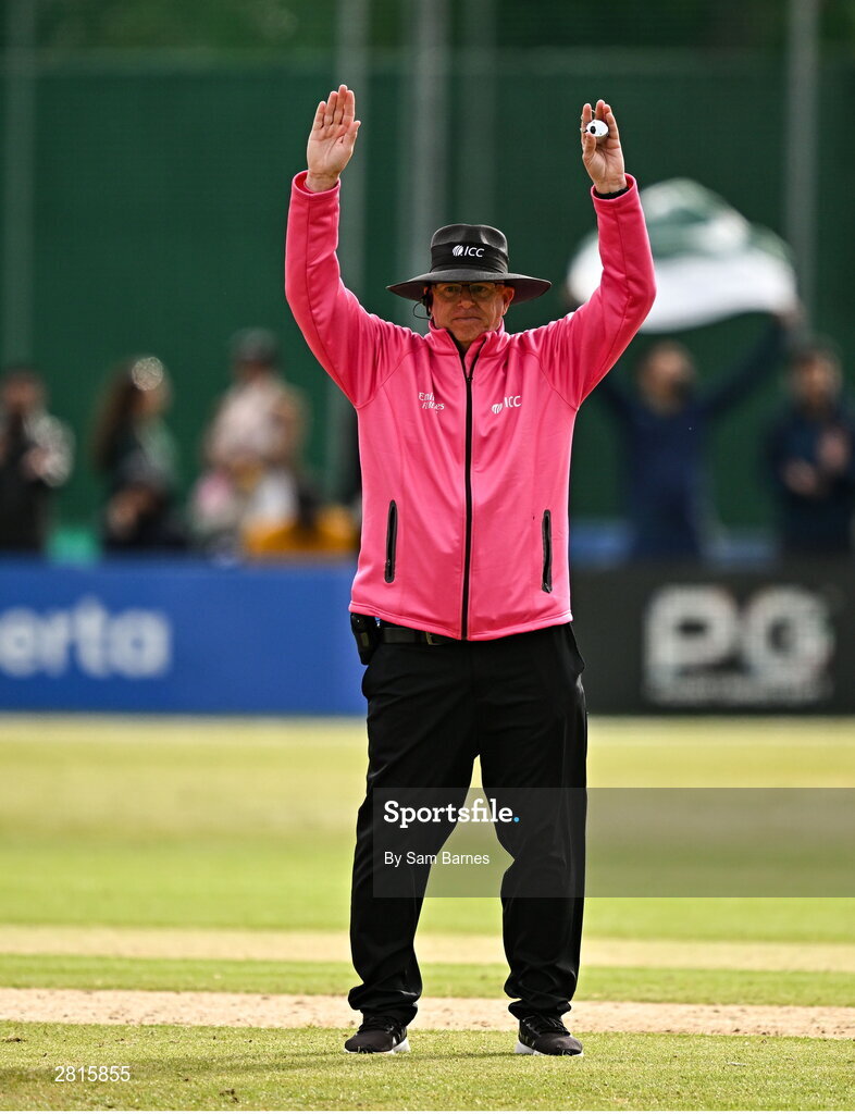 14 May 2024; Umpire Mark Hawthorne during match three of the Floki Men's T20 International Series between Ireland and Pakistan at Castle Avenue Cricket Ground in Dublin. Photo by Sam Barnes/Sportsfile