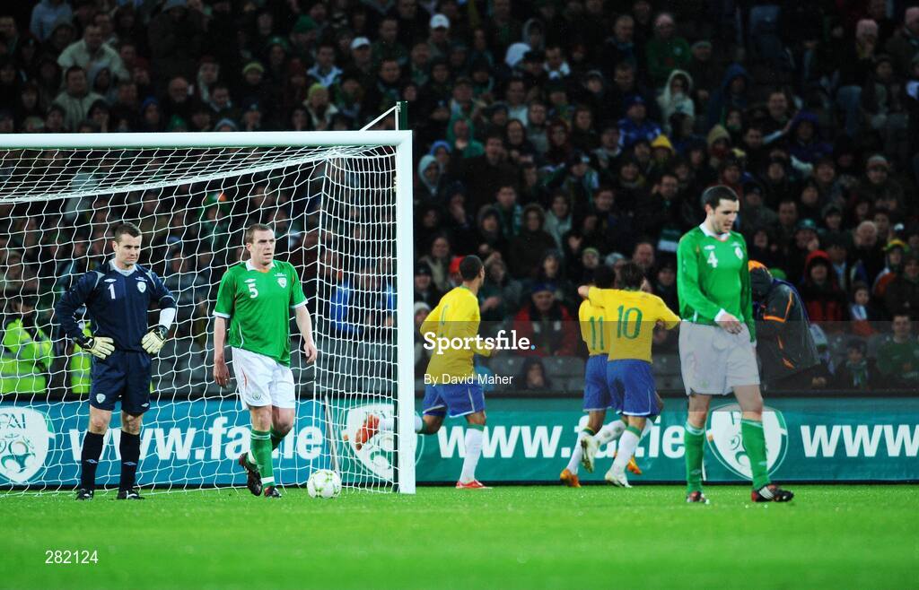 6 February 2008; A dejected Republic of Ireland players, left to right, Shay Given, Richard Dunne and John O'Shea look on as Robson Souza, 11, Brazil, celebrates with his team-mates after scoring his side's first goal. International Friendly, Republic of Ireland v Brazil, Croke Park, Dublin. Picture credit; David Maher / SPORTSFILE