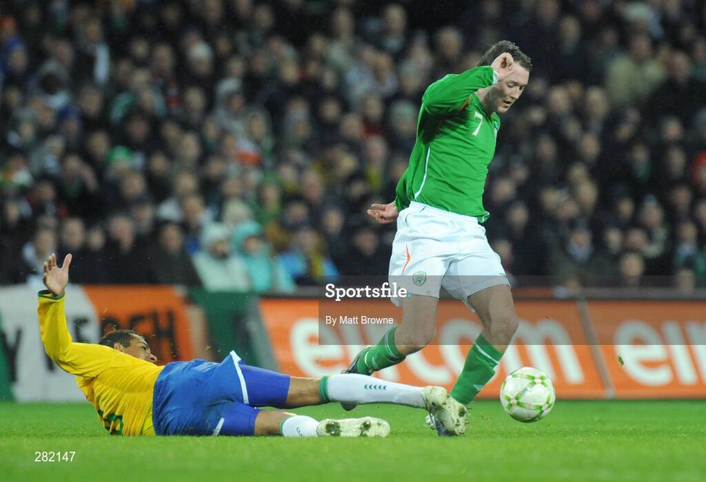 6 February 2008; Aiden McGeedy, Republic of Ireland, in action against Gilberto Silva, Brazil. International Friendly, Republic of Ireland v Brazil, Croke Park, Dublin. Picture credit; Matt Browne / SPORTSFILE