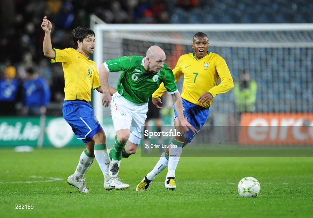 6 February 2008; Lee Carsley, Republic of Ireland, in action against Julio Baptista, right, and Diego Ribas, Brazil. International Friendly, Republic of Ireland v Brazil, Croke Park, Dublin. Picture credit; Brian Lawless / SPORTSFILE