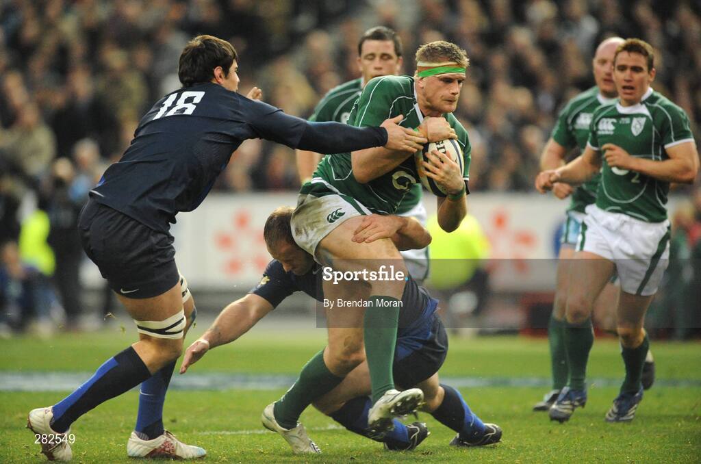 9 February 2008; Jamie Heaslip, Ireland, is tackled by Willaiam Servat and Louis Picamoles, France. RBS Six Nations Rugby Championship, France v Ireland, Stade De France, Paris, France. Picture credit; Brendan Moran / SPORTSFILE *** Local Caption ***