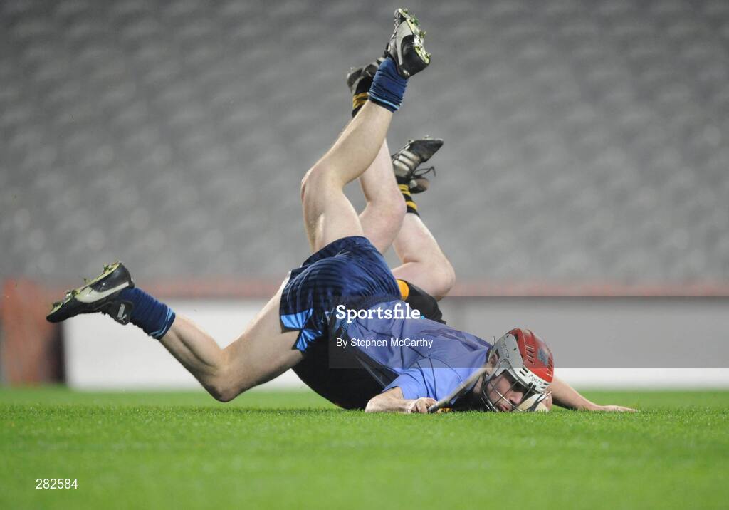 9 February 2008; Paul Johnson, Moyle Rovers, takes a tumble alongside Eoin Murphy, Conahy Shamrocks. All Ireland Junior Club Hurling Championship Final, Moyle Rovers, Tipperary v Conahy Shamrocks, Kilkenny, Croke Park, Dublin. Picture credit; Stephen McCarthy / SPORTSFILE