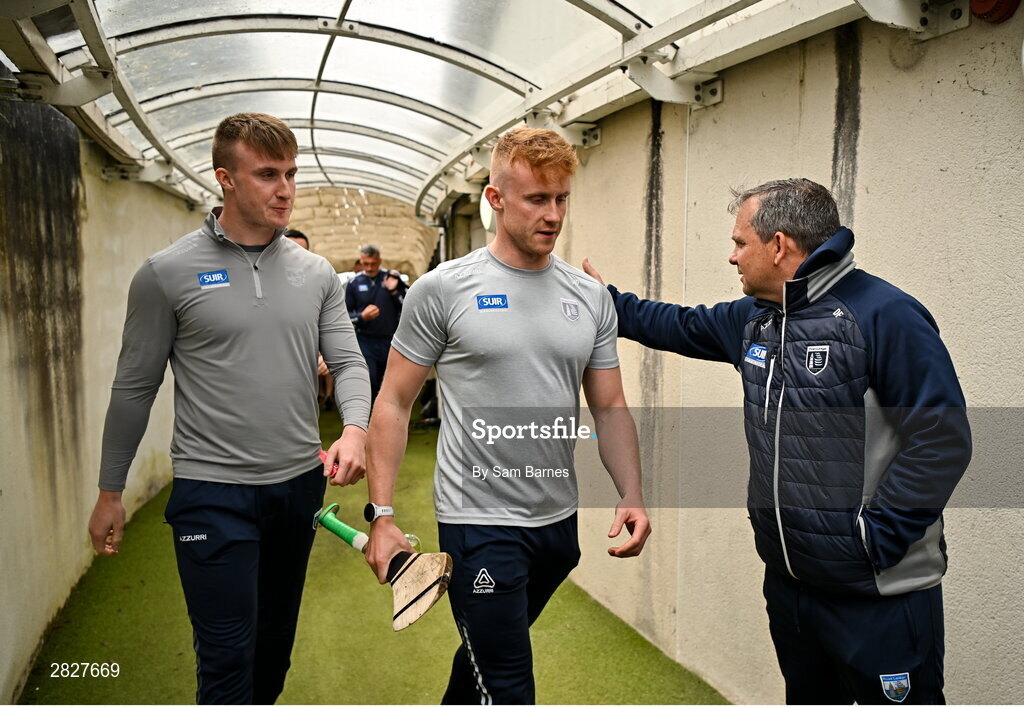 26 May 2024; Waterford manager Davy Fitzgerald greets his players, including Iarlaith Daly, centre, before the Munster GAA Hurling Senior Championship Round 5 match between Limerick and Waterford at TUS Gaelic Grounds in Limerick Photo by Sam Barnes/Sportsfile