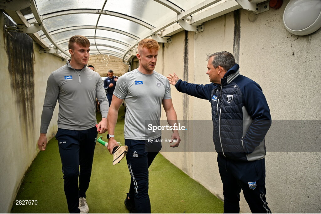 26 May 2024; Waterford manager Davy Fitzgerald greets his players, including Iarlaith Daly, centre, before the Munster GAA Hurling Senior Championship Round 5 match between Limerick and Waterford at TUS Gaelic Grounds in Limerick Photo by Sam Barnes/Sportsfile