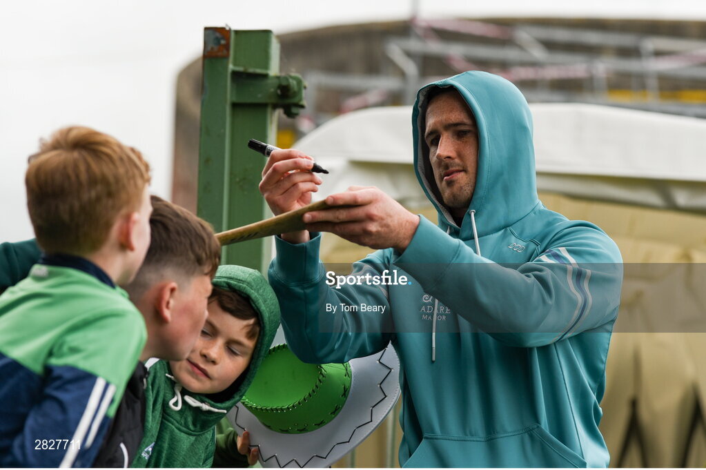 26 May 2024; Injured Limerick player Darragh O’Donovan signs autographs before the Munster GAA Hurling Senior Championship Round 5 match between Limerick and Waterford at TUS Gaelic Grounds in Limerick Photo by Tom Beary/Sportsfile