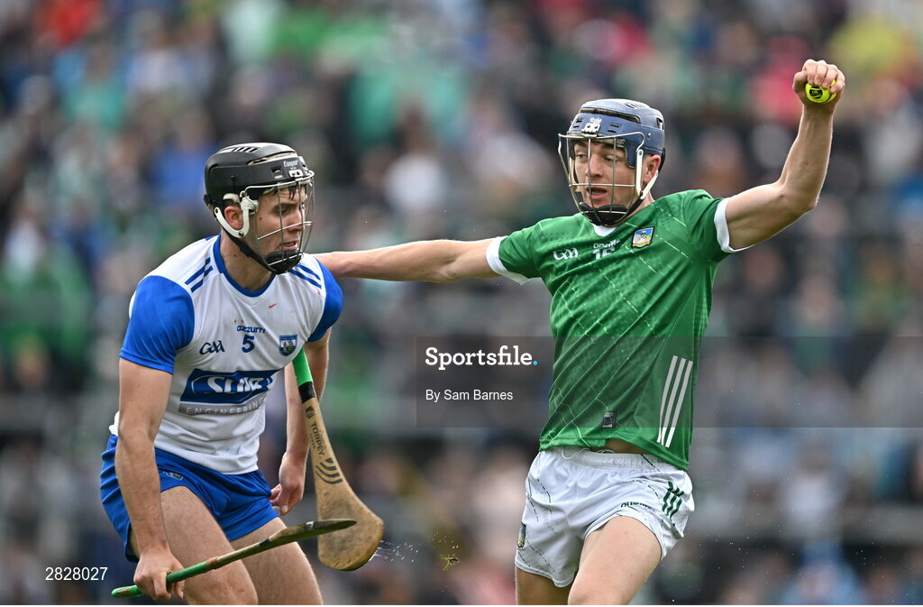 26 May 2024; David Reidy of Limerick in action against Mark Fitzgerald of Waterford during the Munster GAA Hurling Senior Championship Round 5 match between Limerick and Waterford at TUS Gaelic Grounds in Limerick Photo by Sam Barnes/Sportsfile