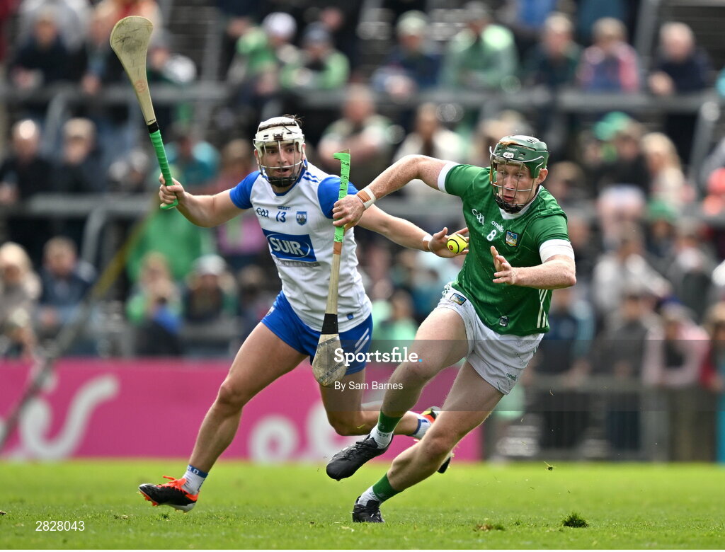 26 May 2024; Will O'Donoghue of Limerick in action against Dessie Hutchinson of Waterford during the Munster GAA Hurling Senior Championship Round 5 match between Limerick and Waterford at TUS Gaelic Grounds in Limerick Photo by Sam Barnes/Sportsfile