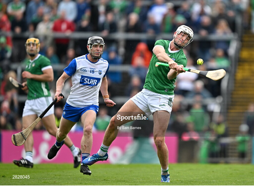 26 May 2024; Kyle Hayes of Limerick scores a point from play under pressure from Kevin Mahony of Waterford during the Munster GAA Hurling Senior Championship Round 5 match between Limerick and Waterford at TUS Gaelic Grounds in Limerick Photo by Sam Barnes/Sportsfile