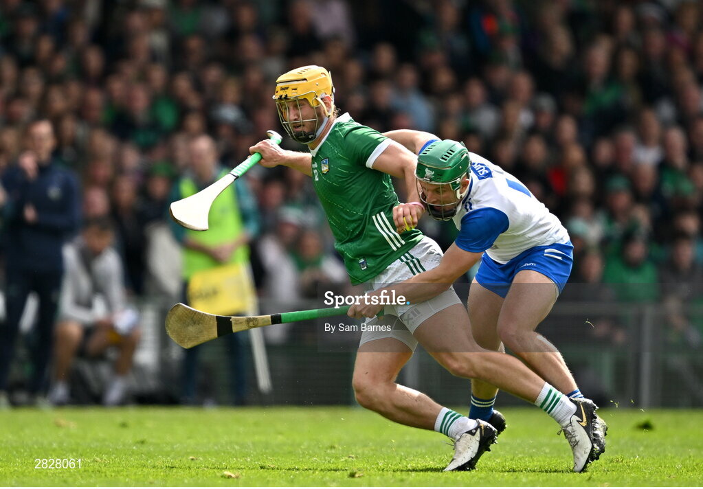 26 May 2024; Tom Morrissey of Limerick in action against Jack Prendergast of Waterford during the Munster GAA Hurling Senior Championship Round 5 match between Limerick and Waterford at TUS Gaelic Grounds in Limerick Photo by Sam Barnes/Sportsfile