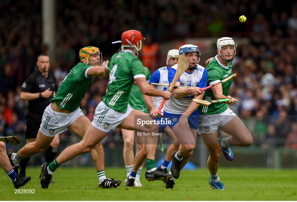 26 May 2024; Stephen Bennett of Waterford is tackled by Kyle Hayes of Limerick during the Munster GAA Hurling Senior Championship Round 5 match between Limerick and Waterford at TUS Gaelic Grounds in Limerick Photo by Tom Beary/Sportsfile
