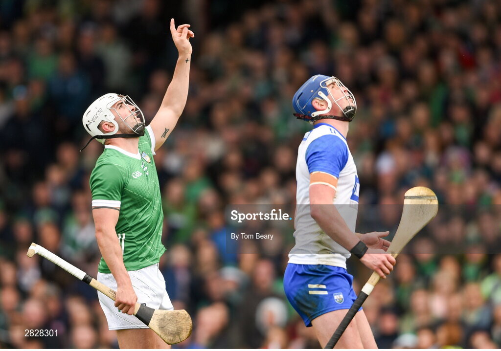 26 May 2024; Aaron Gillane of Limerick celebrates the scoring of a Diarmaid Byrnes (not pictured) point from a free while Darragh Lyons of Waterford watches on during the Munster GAA Hurling Senior Championship Round 5 match between Limerick and Waterford at TUS Gaelic Grounds in Limerick Photo by Tom Beary/Sportsfile