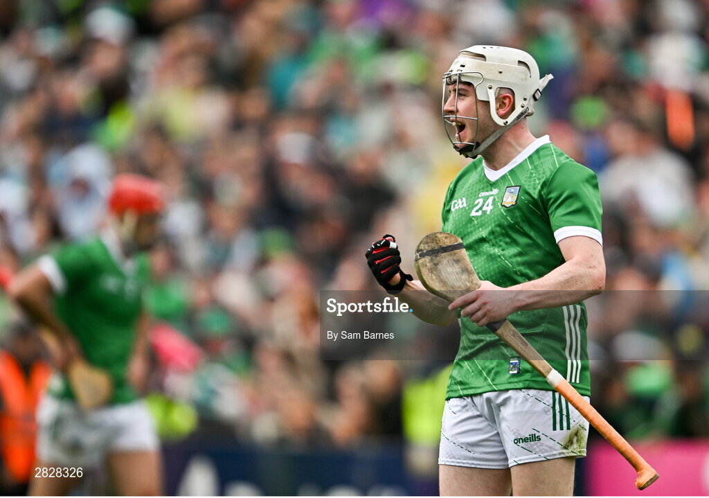 26 May 2024; Fergal O'Connor of Limerick celebrates after his side's victory during the Munster GAA Hurling Senior Championship Round 5 match between Limerick and Waterford at TUS Gaelic Grounds in Limerick Photo by Sam Barnes/Sportsfile