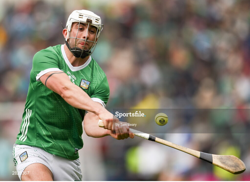 26 May 2024; Aaron Gillane of Limerick scores a point from a free in the final minutes of the Munster GAA Hurling Senior Championship Round 5 match between Limerick and Waterford at TUS Gaelic Grounds in Limerick Photo by Tom Beary/Sportsfile
