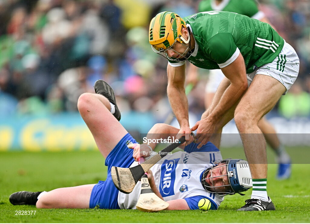 26 May 2024; Stephen Bennett of Waterford in action against Dan Morrissey of Limerick during the Munster GAA Hurling Senior Championship Round 5 match between Limerick and Waterford at TUS Gaelic Grounds in Limerick Photo by Sam Barnes/Sportsfile