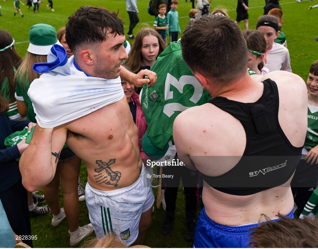 26 May 2024; Aaron Gillane of Limerick swops jersey’s with Stephen Bennett of Waterford after the Munster GAA Hurling Senior Championship Round 5 match between Limerick and Waterford at TUS Gaelic Grounds in Limerick Photo by Tom Beary/Sportsfile