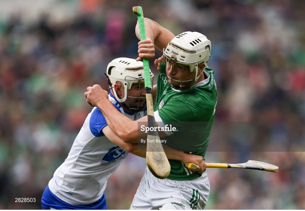 26 May 2024; Kyle Hayes of Limerick is tackled by Padraig Fitzgerald of Waterford during the Munster GAA Hurling Senior Championship Round 5 match between Limerick and Waterford at TUS Gaelic Grounds in Limerick Photo by Tom Beary/Sportsfile
