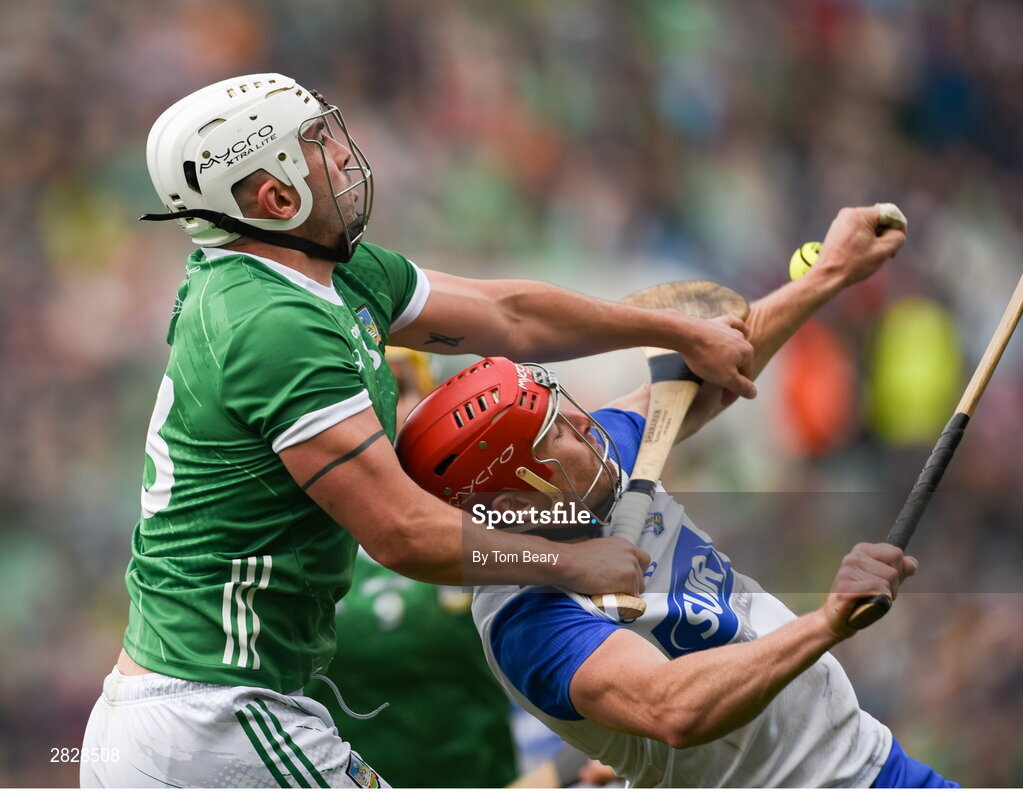 26 May 2024; Aaron Gillane of Limerick in action against Tadhg de Burca of Waterford during the Munster GAA Hurling Senior Championship Round 5 match between Limerick and Waterford at TUS Gaelic Grounds in Limerick Photo by Tom Beary/Sportsfile