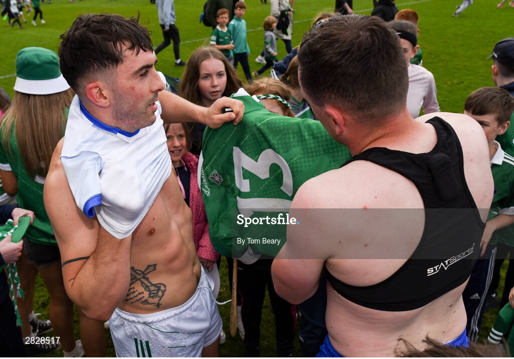 26 May 2024; Aaron Gillane of Limerick swops jersey’s with Stephen Bennett of Waterford after the Munster GAA Hurling Senior Championship Round 5 match between Limerick and Waterford at TUS Gaelic Grounds in Limerick Photo by Tom Beary/Sportsfile