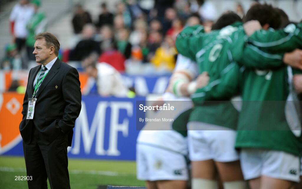 9 February 2008; Ireland head coach Eddie O'Sullivan stands as the team gather together in a huddle before the game. RBS Six Nations Rugby Championship, France v Ireland, Stade De France, Paris, France. Picture credit; Brendan Moran / SPORTSFILE *** Local Caption ***