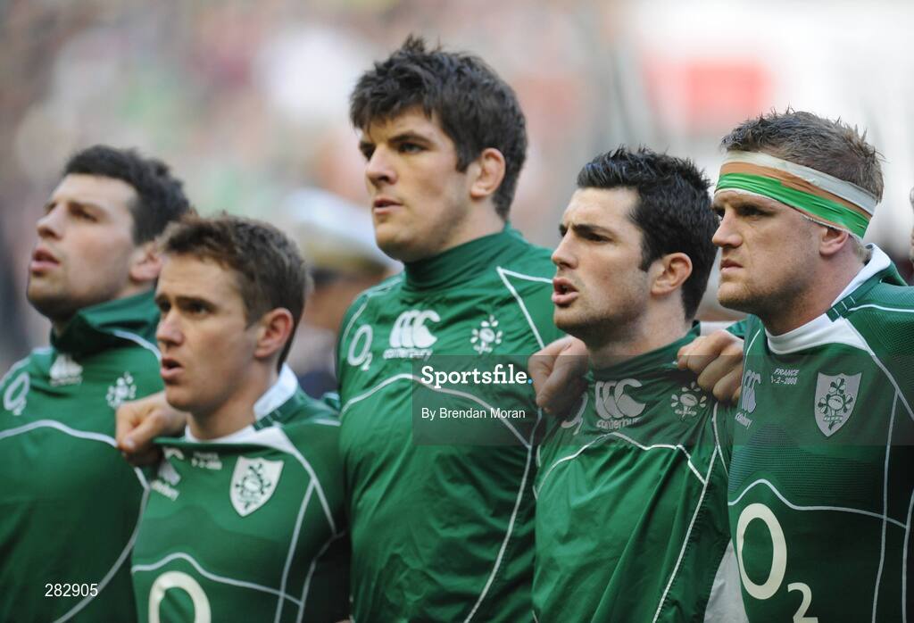9 February 2008; Ireland players, from left, Denis Leamy, Eoin Reddan, Donncha O'Callaghan, Rob Kearney and Jamie Heaslip stand together for the national anthems before the game. RBS Six Nations Rugby Championship, France v Ireland, Stade De France, Paris, France. Picture credit; Brendan Moran / SPORTSFILE *** Local Caption ***