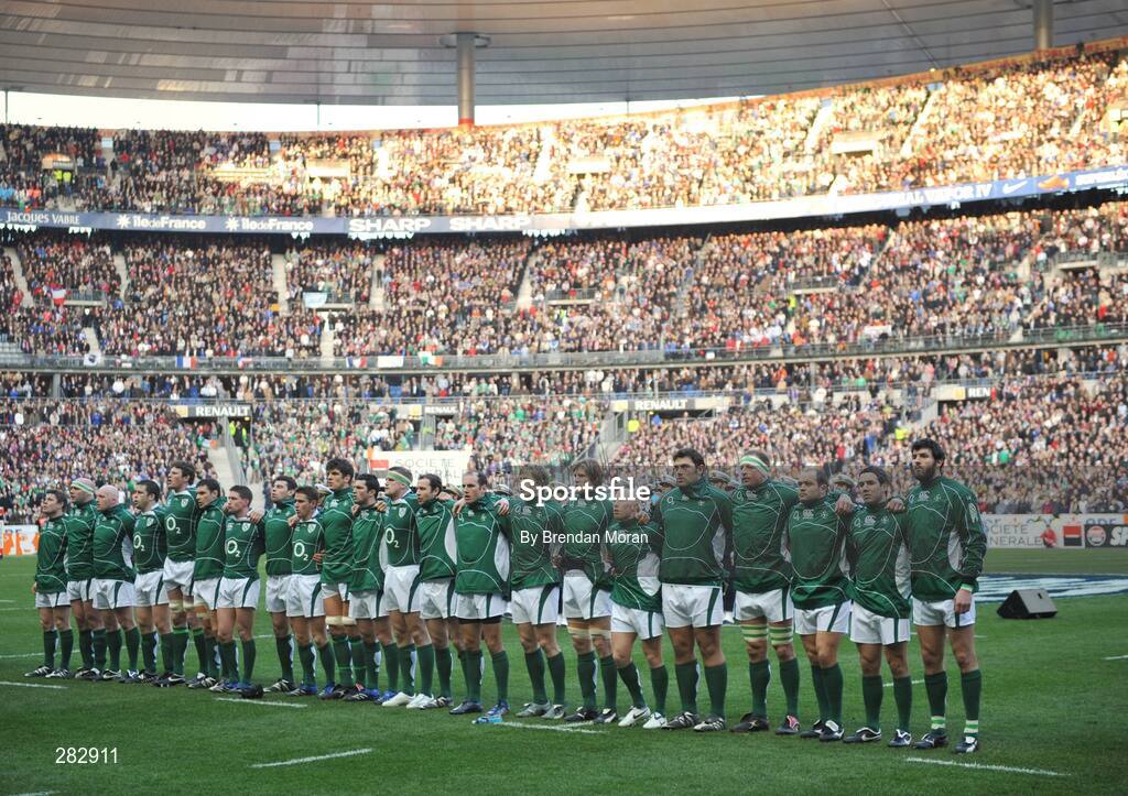 9 February 2008; The Ireland squad stand for the national anthems before the game. RBS Six Nations Rugby Championship, France v Ireland, Stade De France, Paris, France. Picture credit; Brendan Moran / SPORTSFILE *** Local Caption ***