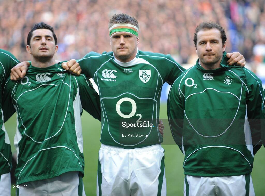 9 February 2008; Ireland's Jamie Heaslip with team-mates Rob Kearney, left, and Geordan Murphy, right, during the lineup before the start of the game. RBS Six Nations Rugby Championship, France v Ireland, Stade De France, Paris, France. Picture credit; Matt Browne / SPORTSFILE