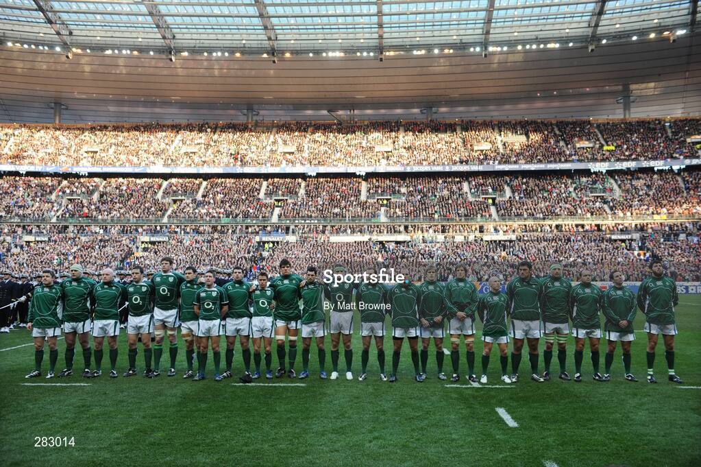 9 February 2008; The Ireland team stand for the National Anthem. RBS Six Nations Rugby Championship, France v Ireland, Stade De France, Paris, France. Picture credit; Matt Browne / SPORTSFILE