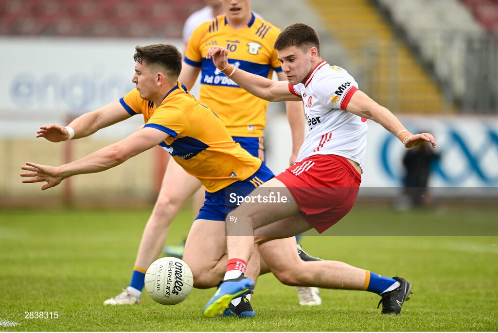 2 June 2024; Niall Devlin of Tyrone scoring his sides first goal despite the attention of Brian McNamara of Clare during the GAA Football All-Ireland Senior Championship Round 2 match between Tyrone and Clare at O'Neill's Healy Park in Omagh, Tyrone.