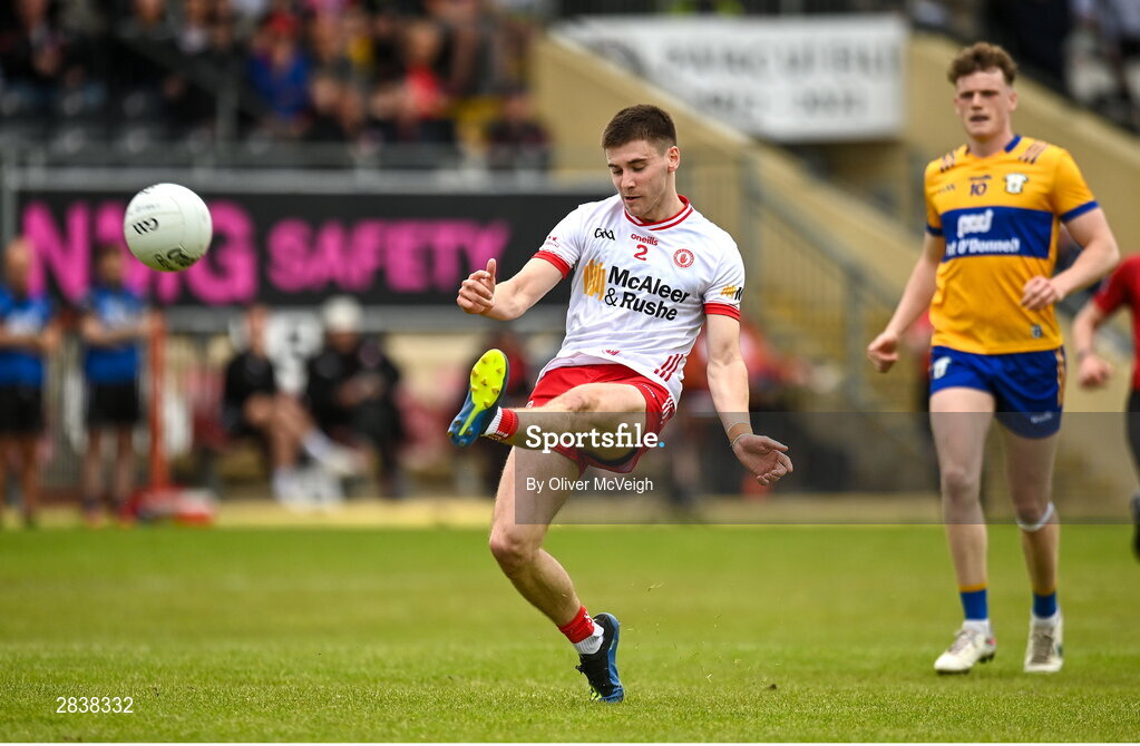 2 June 2024; Niall Devlin of Tyrone scoring a first half point during the GAA Football All-Ireland Senior Championship Round 2 match between Tyrone and Clare at O'Neill's Healy Park in Omagh, Tyrone. Photo by Oliver McVeigh/Sportsfile