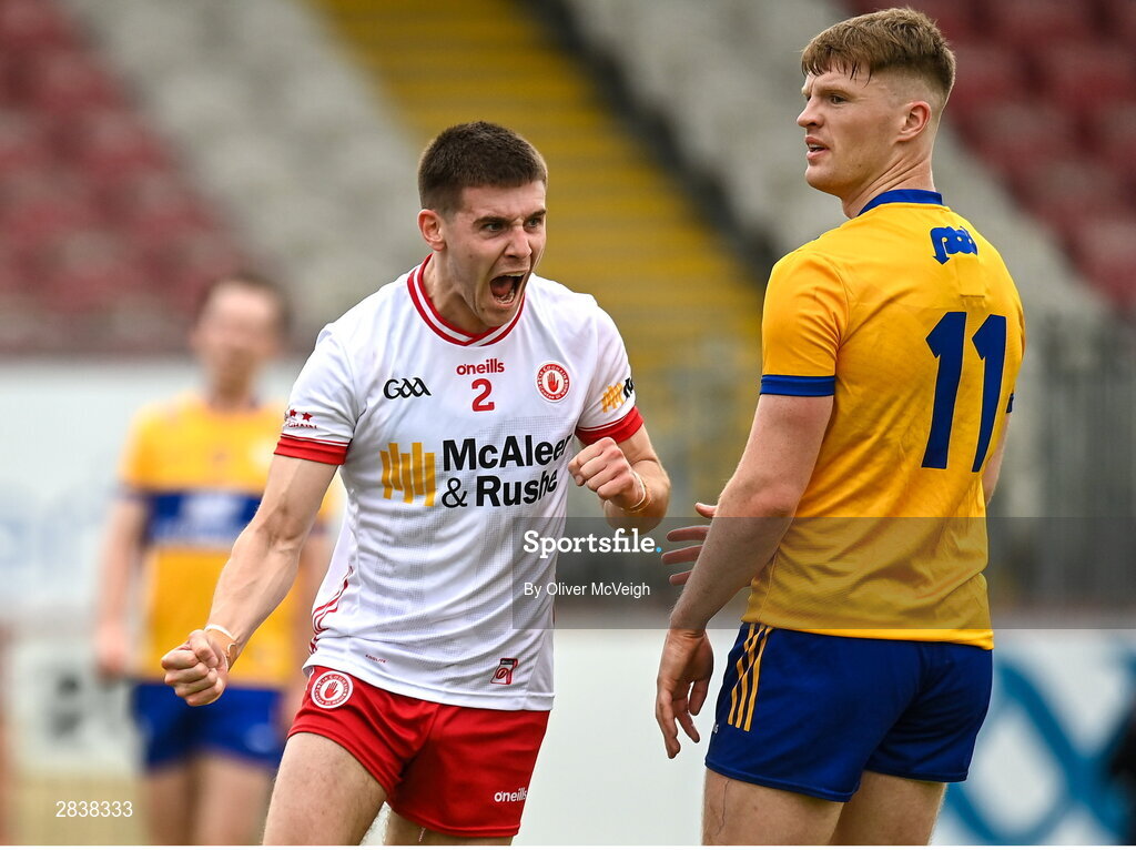 2 June 2024; Niall Devlin of Tyrone celebrates scoring his side's second goal during the GAA Football All-Ireland Senior Championship Round 2 match between Tyrone and Clare at O'Neill's Healy Park in Omagh, Tyrone. Photo by Oliver McVeigh/Sportsfile