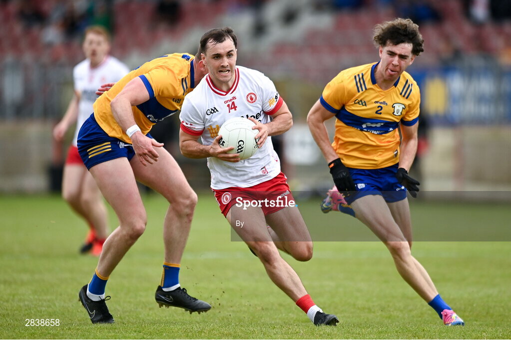 2 June 2024; Darragh Canavan of Tyrone in action against Manus Doherty of Clare during the GAA Football All-Ireland Senior Championship Round 2 match between Tyrone and Clare at O'Neill's Healy Park in Omagh, Tyrone.