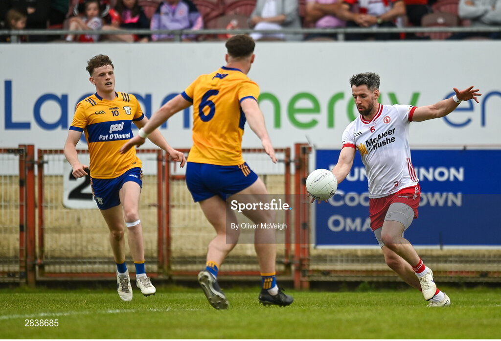 2 June 2024; Matthew Donnelly of Tyrone in action against Cillian Rouine of Clare during the GAA Football All-Ireland Senior Championship Round 2 match between Tyrone and Clare at O'Neill's Healy Park in Omagh, Tyrone. Photo by Oliver McVeigh/Sportsfile