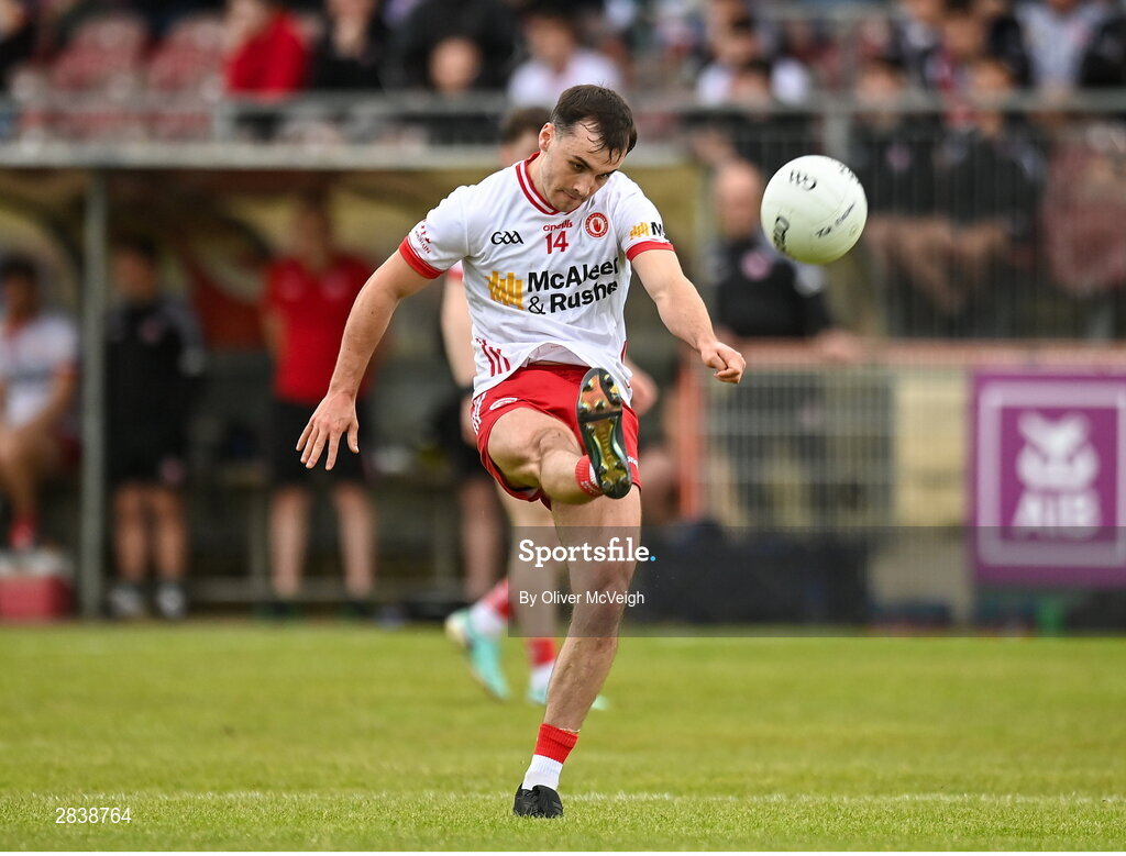 2 June 2024; Darragh Canavan of Tyrone scoring a point during the GAA Football All-Ireland Senior Championship Round 2 match between Tyrone and Clare at O'Neill's Healy Park in Omagh, Tyrone. Photo by Oliver McVeigh/Sportsfile