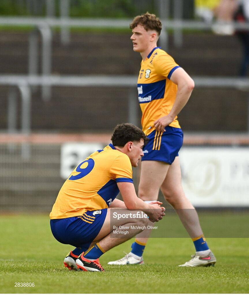 2 June 2024; Jamie Stack and Daniel Walsh of Clare dejected after their side's defeat in the GAA Football All-Ireland Senior Championship Round 2 match between Tyrone and Clare at O'Neill's Healy Park in Omagh, Tyrone. Photo by Oliver McVeigh/Sportsfile