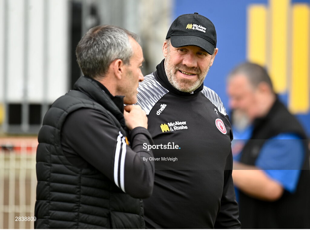 2 June 2024; Tyrone joint-managers Brian Dooher and Feargal Logan before the GAA Football All-Ireland Senior Championship Round 2 match between Tyrone and Clare at O'Neill's Healy Park in Omagh, Tyrone. Photo by Oliver McVeigh/Sportsfile