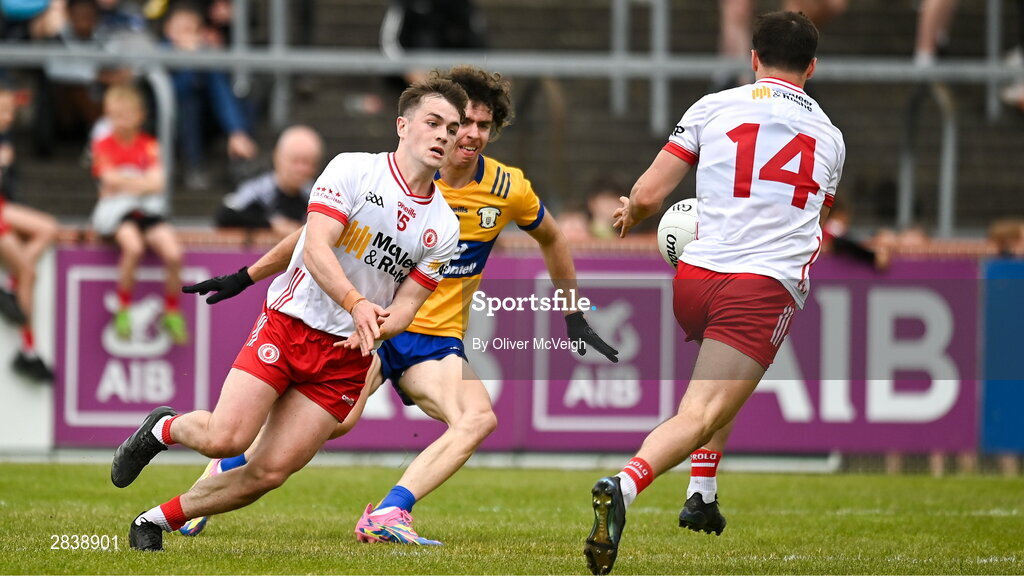 2 June 2024; Ruari Canavan of Tyrone lays the ball off to his brother Darragh Canavan during the GAA Football All-Ireland Senior Championship Round 2 match between Tyrone and Clare at O'Neill's Healy Park in Omagh, Tyrone. Photo by Oliver McVeigh/Sportsfile