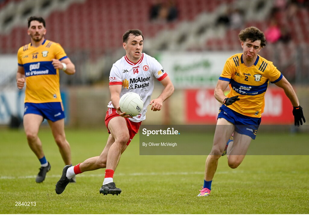 2 June 2024; Darragh Canavan of Tyrone in action against Manus Doherty of Clare during the GAA Football All-Ireland Senior Championship Round 2 match between Tyrone and Clare at O'Neill's Healy Park in Omagh, Tyrone. Photo by Oliver McVeigh/Sportsfile