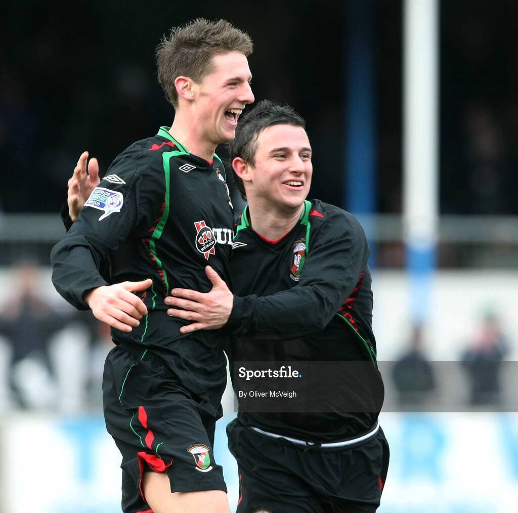 23 February 2008; Glentoran's Daryl Fordyce, left, celebrates his goal with team-mate Shane McCabe. Carnegie Premier league, Newry City v Glentoran, The Showgrounds, Newry, Co. Down. Picture credit; Oliver McVeigh / SPORTSFILE